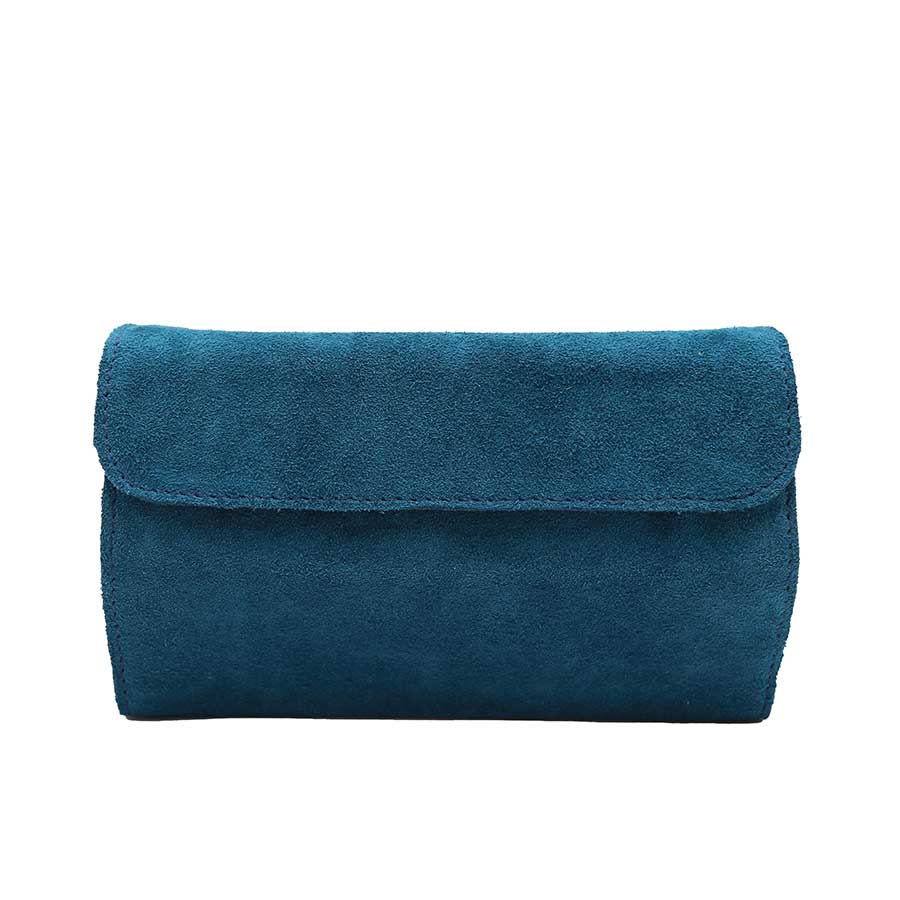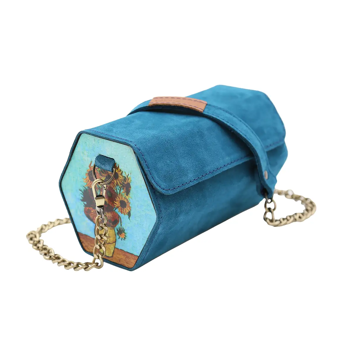 ნატურალური ზამშით და ხის კომბინაციით შექმნილი ჩანთა, რომელზეც დატანილია მებადურის პრინტი